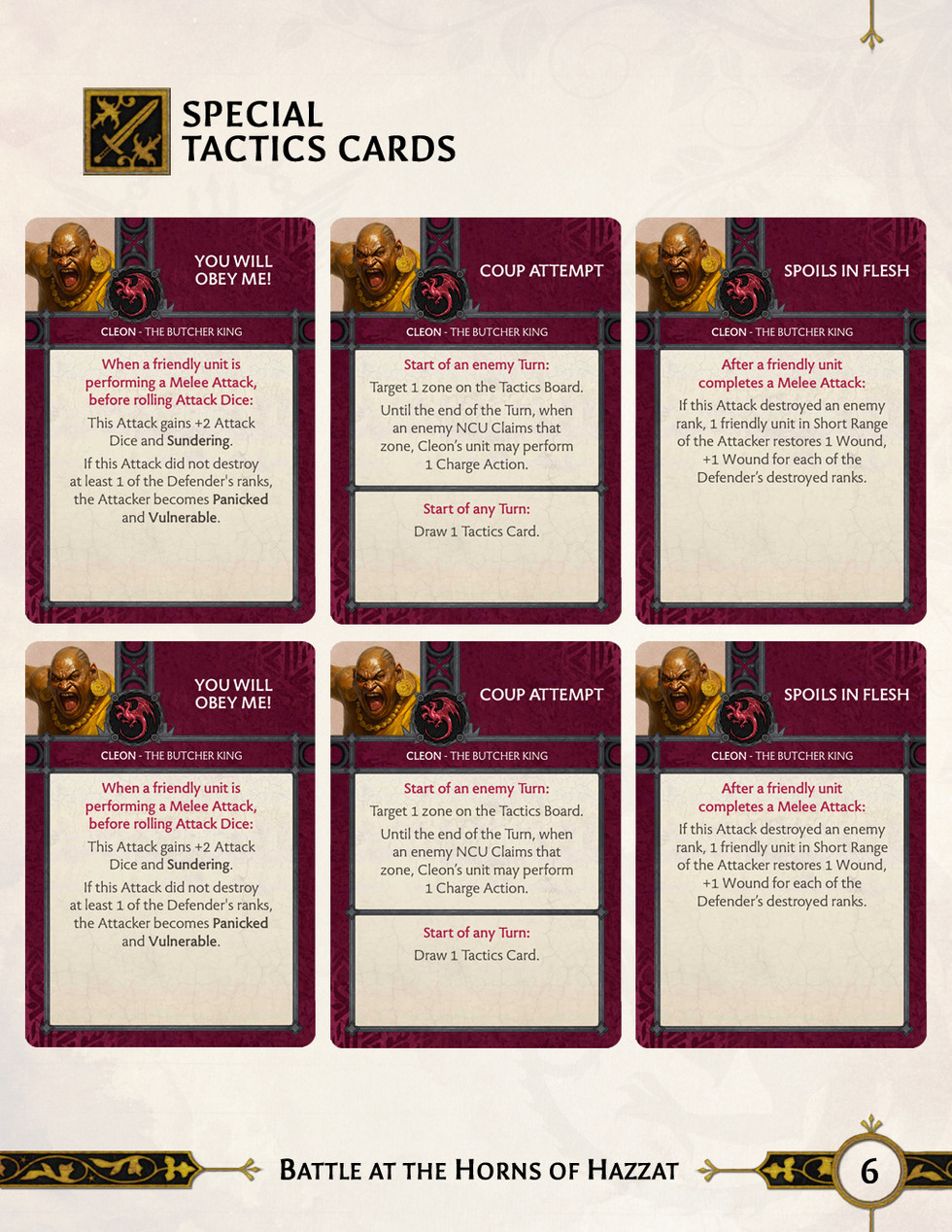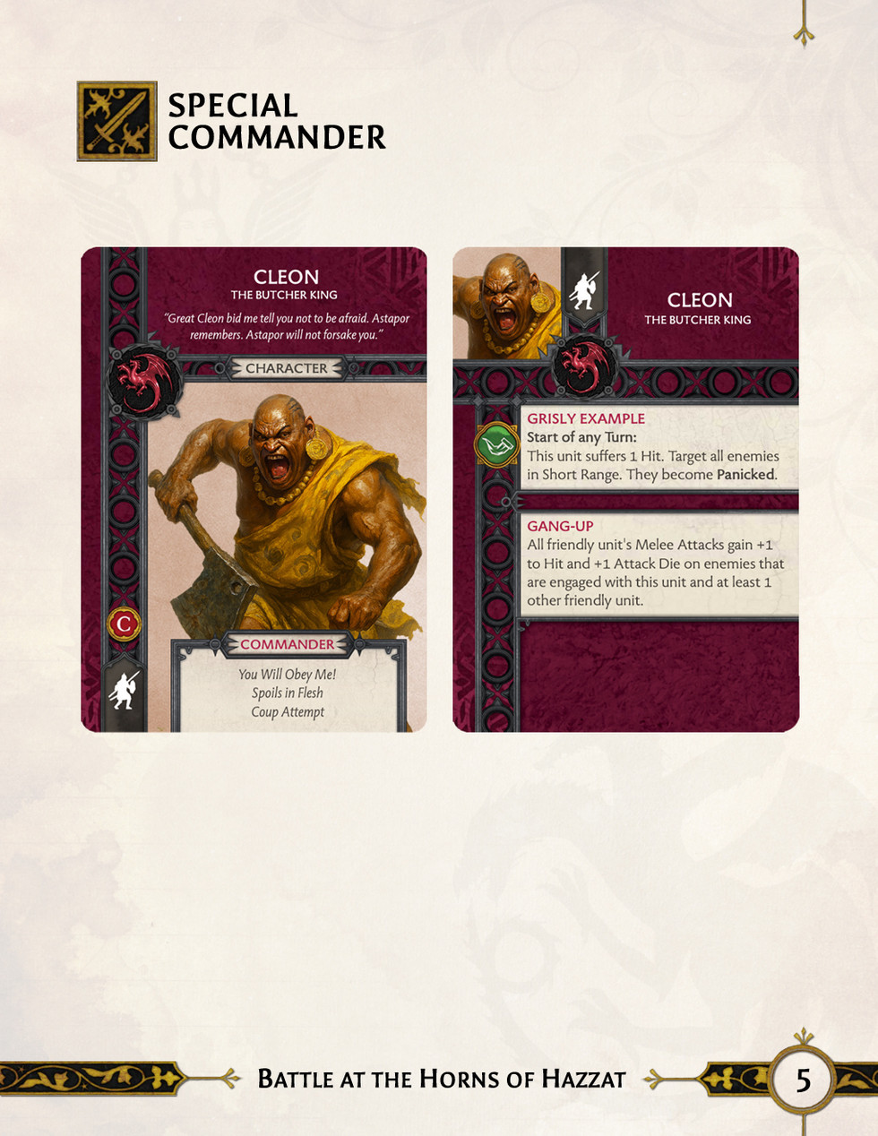 This scenario utilizes the Ghiscari Faction. King Cleon is a very minor character in the books, but I thought it was interesting how many named characters were included in the armies that faced him. The fact that this event includes Quentyn Martell, Gerris Drinkwater, Archibald Yronwood, and all the characters in the Windlbown and Yunkai'i army, it was an easy choice to include as a custom scenario. That meant creating a Cleon commander. The first decision was if I should make him Targaryen, or Ghiscari, or Neutral. Ghiscari didn't make any sense other than the fact that he is part of that culture, but he is actively fighting against them. Neutral seemed like a copout and didn't fit with the 'sword for hire' concept that I think Neutrals should stick to. This left Targaryen, which in the end made the most sense. Though in the story his Unsullied are a poor copy of the real thing, I decided against creating a new unit to keep things simple.